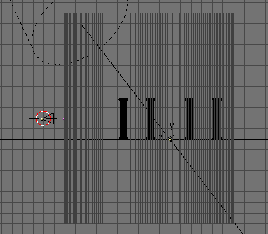 With the camera at z=0, looking forward, turn to front view and add a plane in front of the camera, with its centre aligned with the camera's viewing direction. In side view move the plane where you want your volumetric effect to terminate. In our case somewhere beyond the furthest column. Scale the plane so that it encompasses the whole of the camera's field of view (Figure 4). It is important to have a camera pointing along the y axis since we need the planes to be orthogonal to the line of sight. Anyway, we will be able to move it later on.
