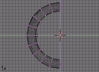 Leave Edit Mode (TAB). With the default settings, Blender will always rotate and scale around the object's center which is displayed as a tiny dot. This dot is yellow when the object is unselected and pink when it is selected. With the cursor still in the origin, press the Center Cursor button in the Edit Buttons window to move the object center to the current cursor location. Now press RKEY and rotate the tube 180 degrees around the cursor.