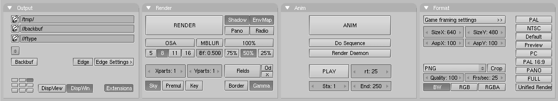 By default the dimensions SizeX and SizeY are 320x256 and can be changed as for any Num Button. The two buttons below define the aspect ratio of the pixels. This is the ratio between the X and Y dimensions of the pixel of the image. By default it is 1:1 since computer screen pixels are square, but can be varied if television shorts are being made since TV pixels are not square. To make life easier the rightmost block of buttons (Figure 3) provides some common presets: