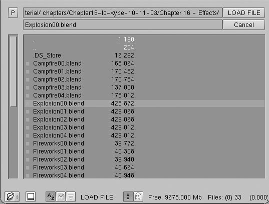 To load a Blender file from disk, press F1. The focused window then temporarily transforms into the File Selection Window as shown in Figure 18. The bar on the left can be dragged with LMB for scrolling. To load a file, select it with LMB and press ENTER, or simply click it with MMB.