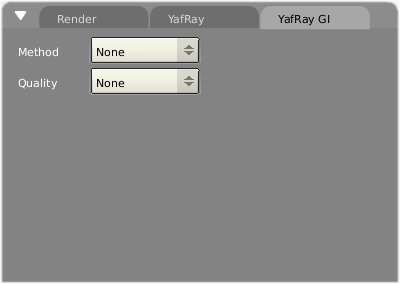 Yafray supports Global Illumination*. We have to go back to the Render tab to learn more about Yafray's implementation of GI. The first look at the Yafray GI tab and you might think. Oh! It is so easy, you are right the features available are simplified for your use. The available options are Method and Quality, lets have a look at them one by one. The quality is the same for both and is explained later.