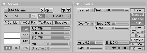 Figure 12 shows some interesting sliders. Alpha governs the opacity of the material; 1 is fully opaque and 0 is fully transparent. SpecTra forces specularity highlights on transparent bodies to be opaque. Shadeless makes the material insensitive to its shading, giving it a uniformly diffuse color.